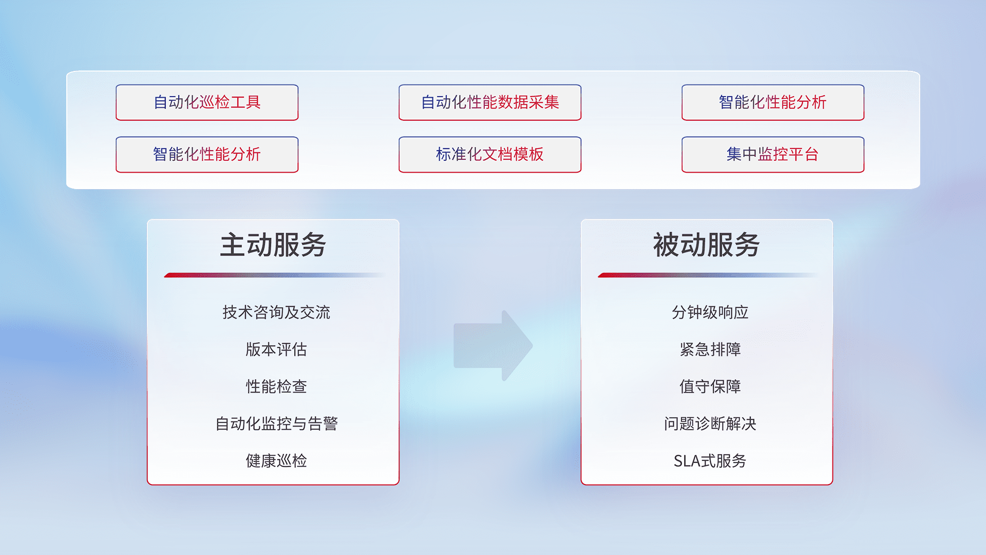 智能化工具和标准化文档,,,保障服务质量,,,提供主动服务(包含技术咨询、、、版本评估、、性能检查、、、、自动化监控与告警、、、、健康巡检)和被动服务包含(分钟级响应、、紧急排障、、、值守保障、、、问题诊断解决、、、、SLA服务)。。。。