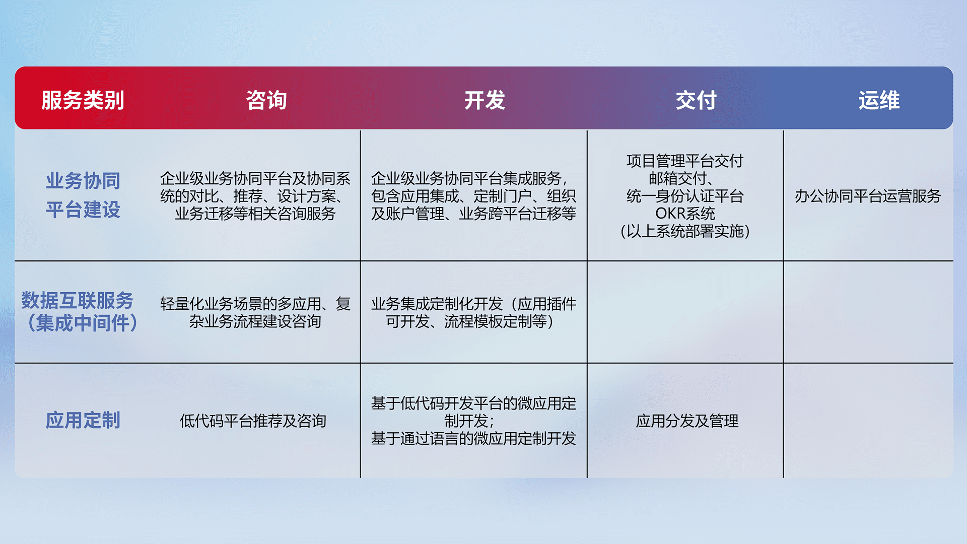 针对钉钉、、、、企微、、、IDaas等平台级产品提供产品的规划、、、、方案、、、交付、、、、定制化开发等服务,,,实现如统一协同办公、、、、智能客户服务、、混合会议管理、、、、智能数据查询、、、、等业务场景,,实现数字化转型。。。。